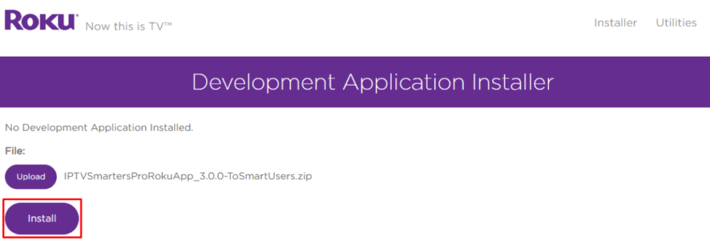 Install the app: Once the ZIP file is uploaded, click the “Install” button on the web interface. The Roku will install the IPTV Smarters app package. You should see a message that the installation was successful.